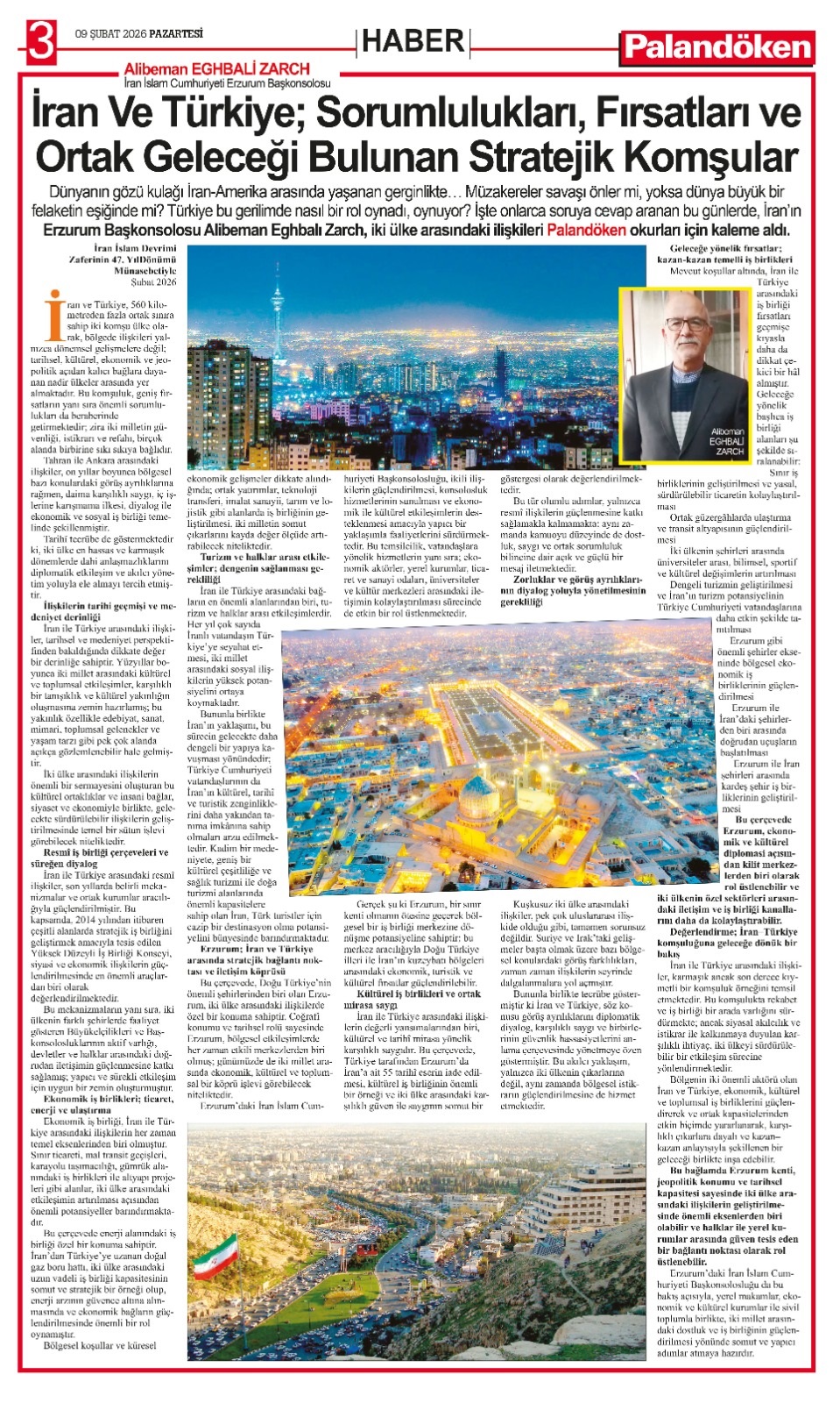 انتشار مقاله سرکنسول کشورمان در روزنامه پالاندوکن با موضوع ایران و ترکیه؛ همسایگان استراتژیک با مسئولیتها، فرصتها و آیندهای مشترک