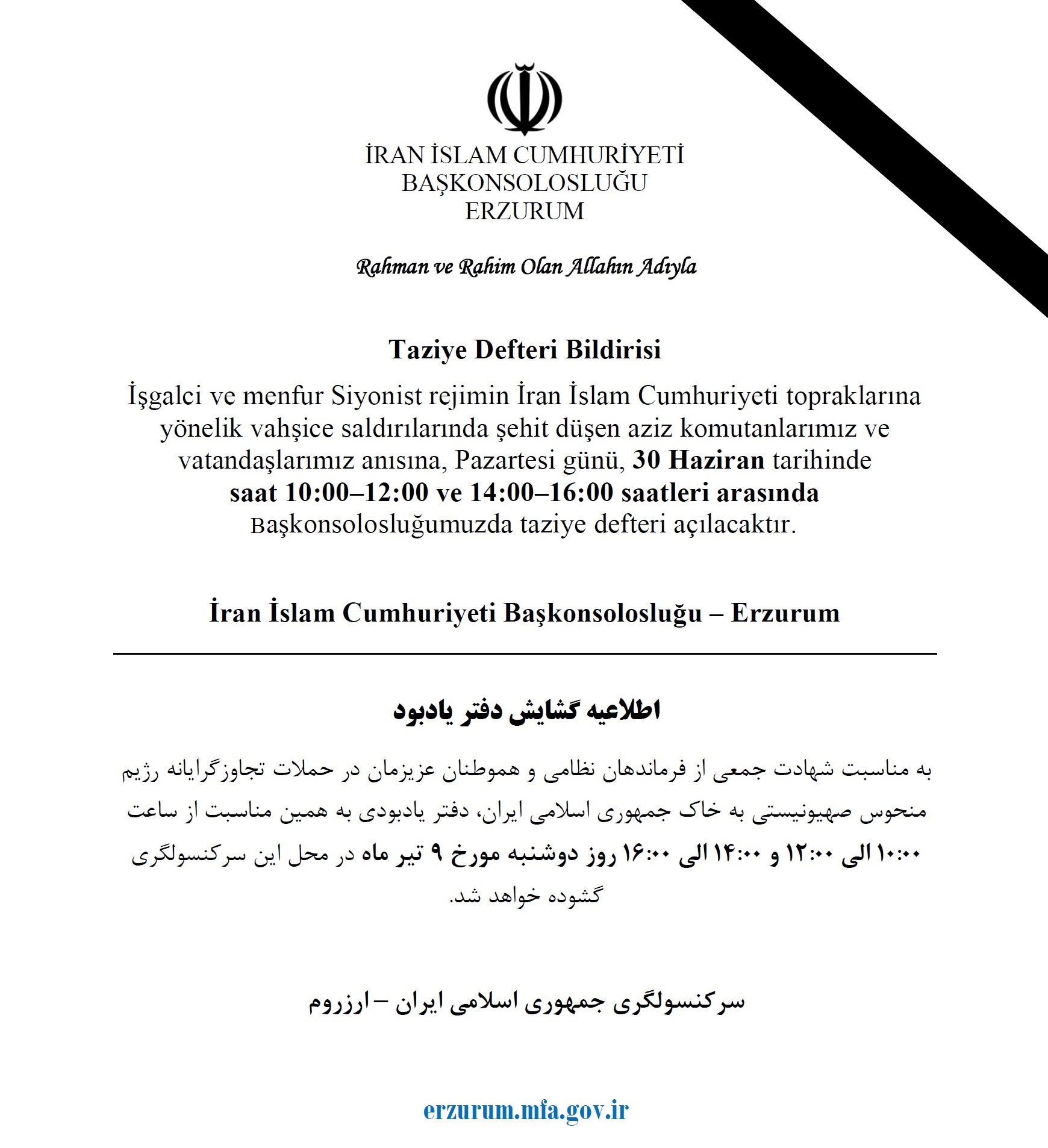 گشایش دفتر یادبود شهدای حملات رژیم صهیونیستی به کشورمان در محل سرکنسولگری جمهوری اسلامی ایران در ارزروم