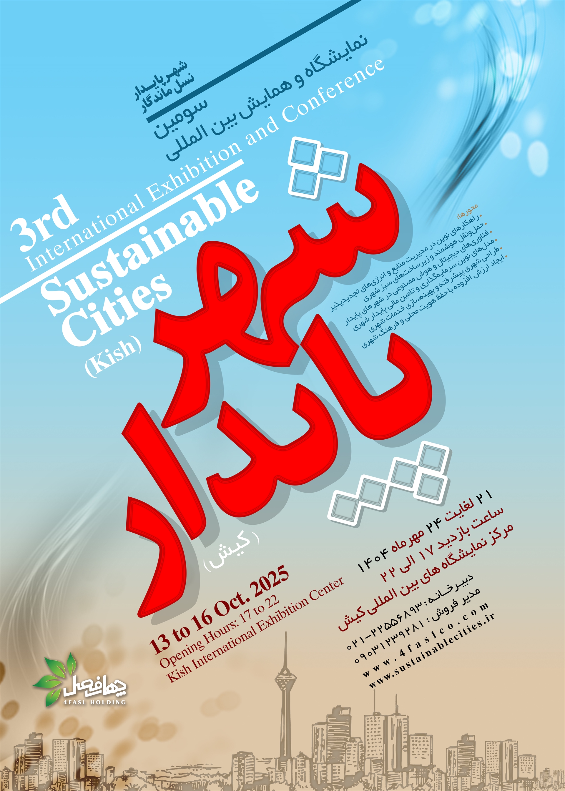 سومین نمایشگاه و همایش بینالمللی شهر پایدار به عنوان رویداد تخصصی منطقهای در حوزه تابآوری شهری، زیست پذیری و شهرهای هوشمند، توسط شرکت «فرداد سیال چهار فصل» از تاریخ 21 الی 24 مهر ماه 1404 (13 الی 16 اکتبر 2025) در جزیره کیش برگزار می شود. علاقمندان جهت مشارکت و کسب اطلاعات بیشتر و انجام هماهنگیهای لازم میتوانند با شماره تلفن: 982122556893+ ، شماره موبایل/ واتساپ: 989912008386+ و ایمیل: info@4faslco.com و info@sustainablecities.ir ارتباط گرفته و یا به وبسایت: www.sustainablecities.ir مراجعه نمایند.