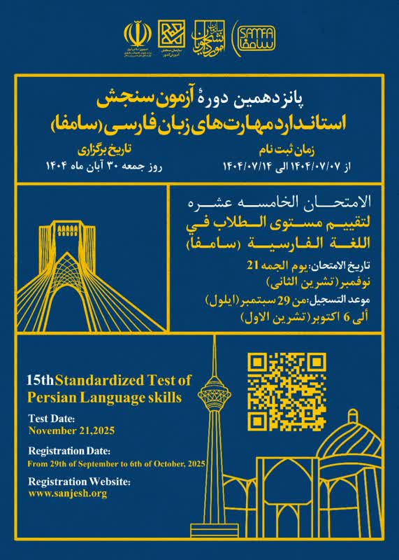 پانزدهمن دوره آزمون سنجش استاندارد مهارت‌های زبان فارسی (سامفا) - نقش نگاره پیوست در روز جمعه 30 آبان ماه 1404 برابر با 21 نوامبر 2025 برگزار خواهد شد.